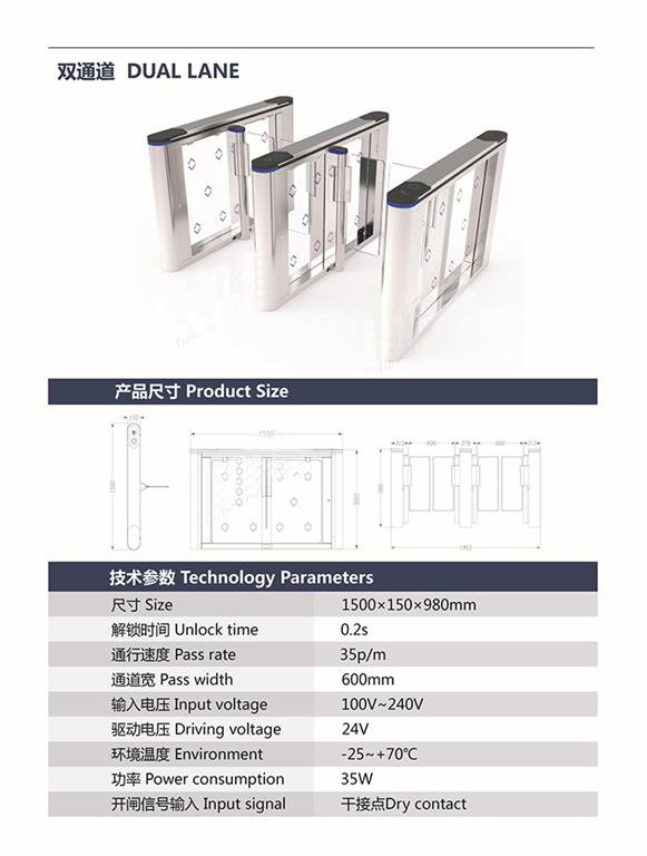 機場_速通門B302功能特點: 1. 進口304不銹鋼; 2. 箱體激光切割加工; 3. 精焊,精磨工藝; 4. 表面原廠拉絲; 5. 紅外防夾保護; 6. 非法闖入紅外報警; 7. 刷卡開閘反向逆行報警; 8. 凈重:單機芯:45kg, 雙機芯:85kg;